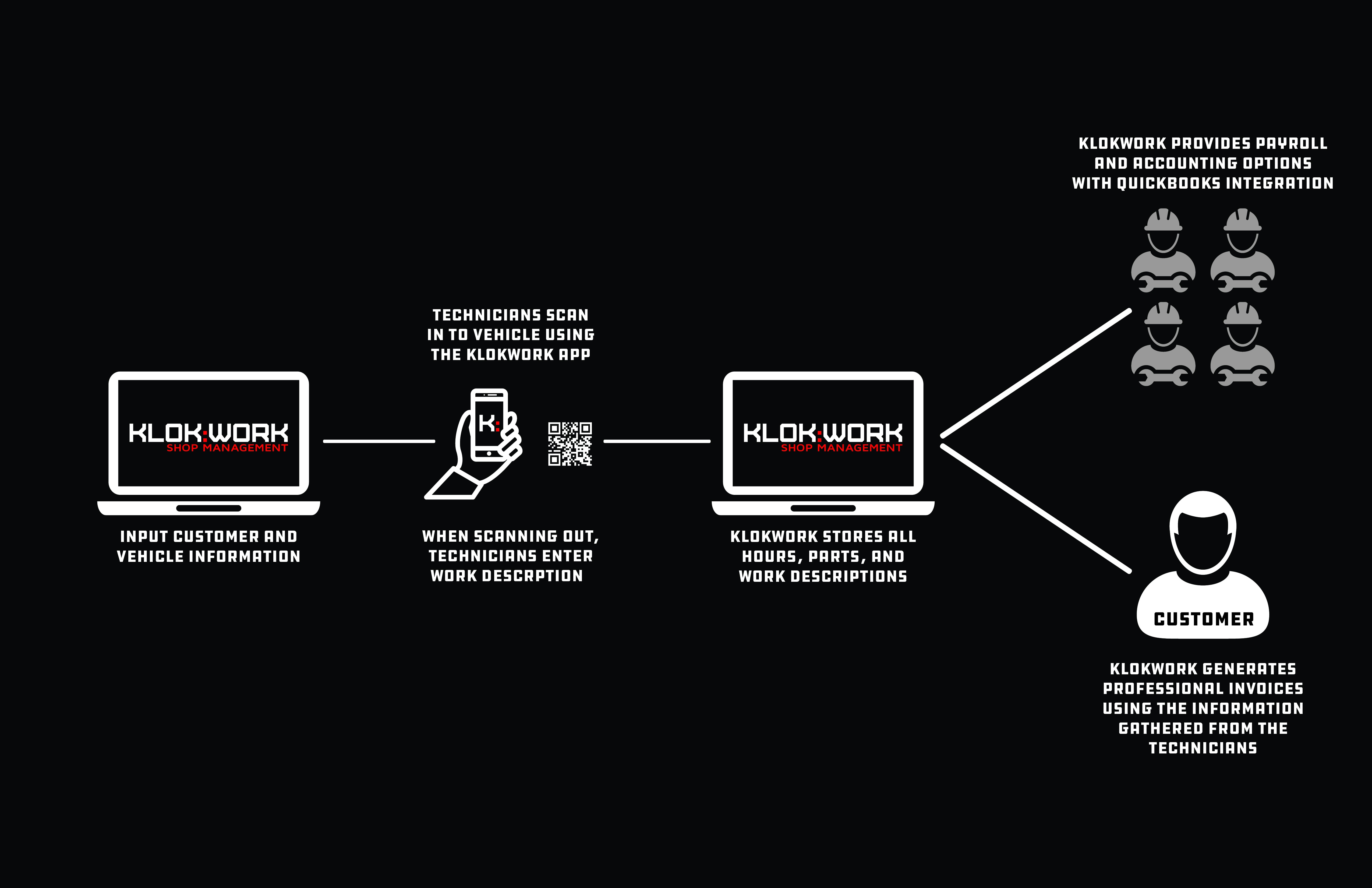 Klokwork is your shop management solution. No time clocks and hand written punch cards. Create invoices without manual data entry. Invoices generated by Klokwork are performed in 87% less time than traditional methods. Digitize, streamline and manage the entire shop process with just one system: